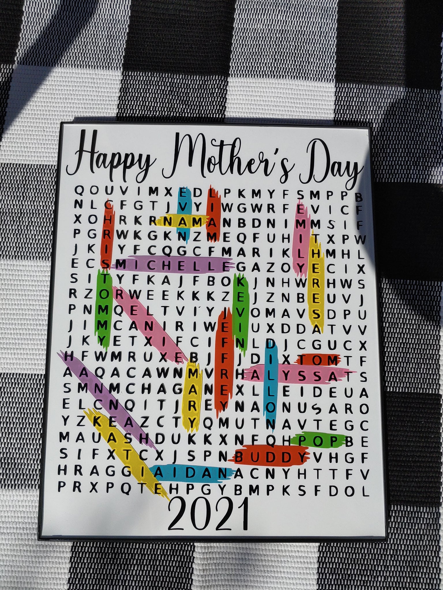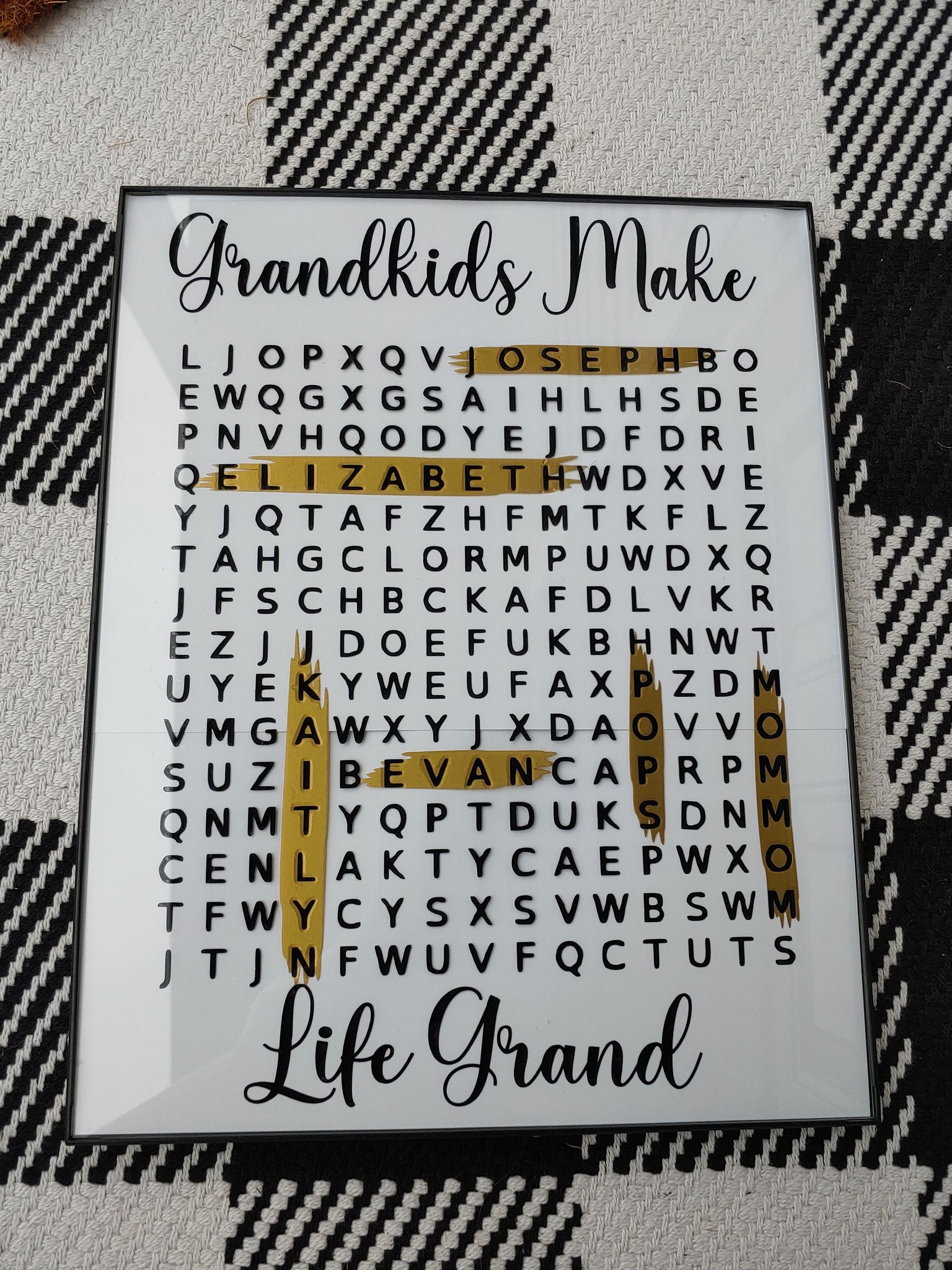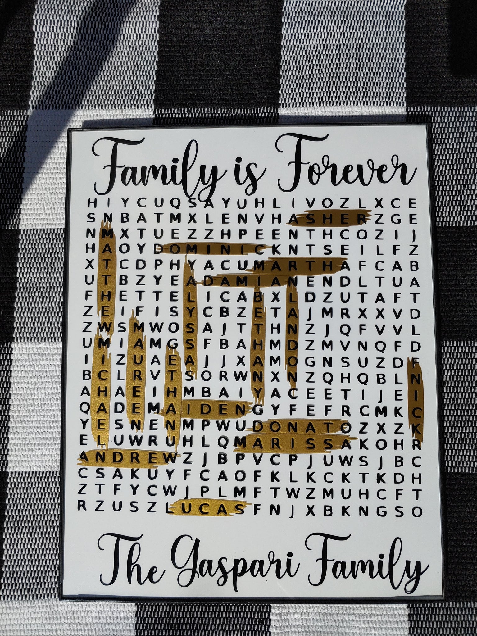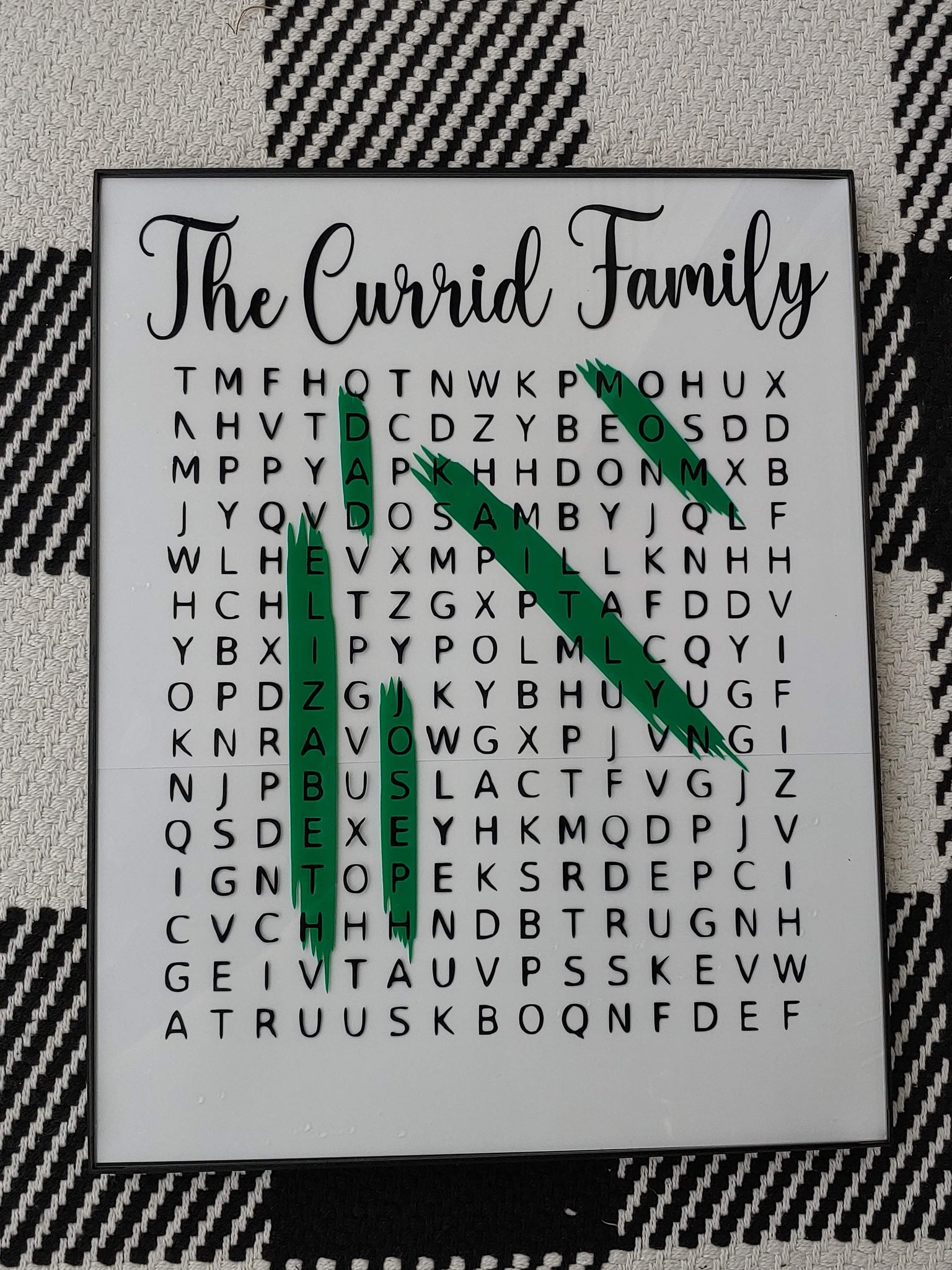 Glass Framed Personalized Word Search. Each frame is 11x14. This is a perfect gift for moms and grandmas! Each word search is customized for the names provided. Colors can be completely customized, as well as a saying across the top and/or bottom. Please separate names in the names box with a colon or semi-colon. Make sure to also provide the family name if that is an option you chose. The Word Search letters and headings will be in black unless otherwise noted.