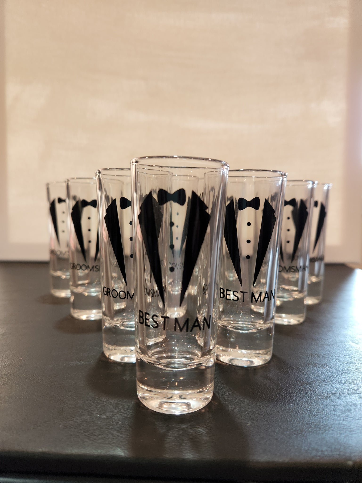 Groomsman/Best man Shot Glasses. Each glass is 2oz and is a skinny tall glass. The design is a tux and bowtie with the title underneath. Vinyl color can also be changed to match wedding colors.