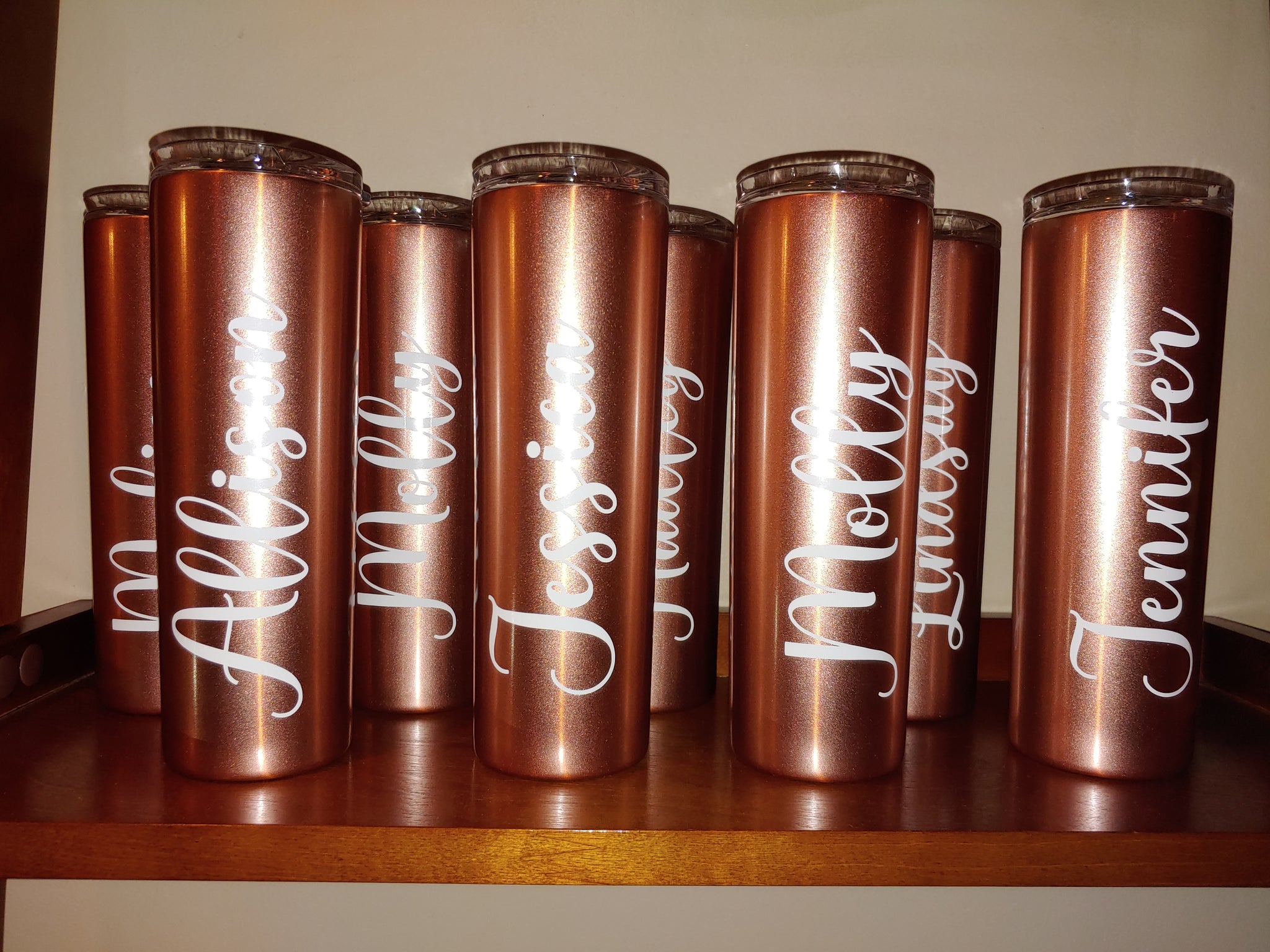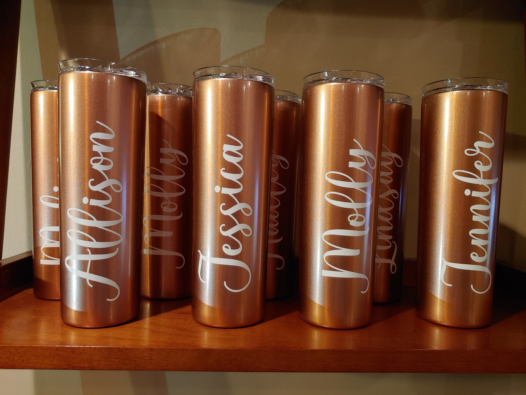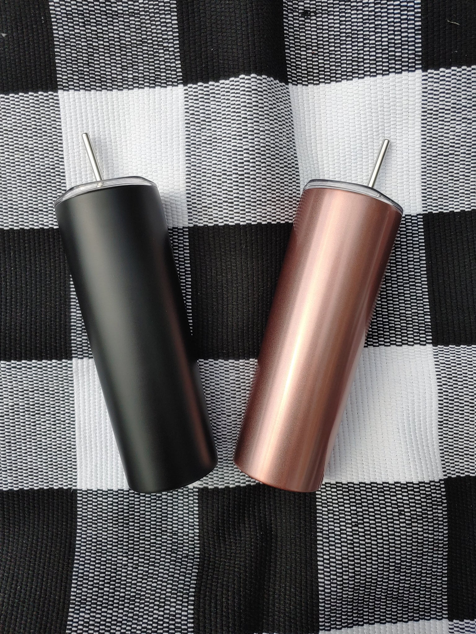 Slim Tumblers. Each tumbler is 20 ounces, and is stainless steel. They each come with a straw and straw cleaner brush. Two color choices available.