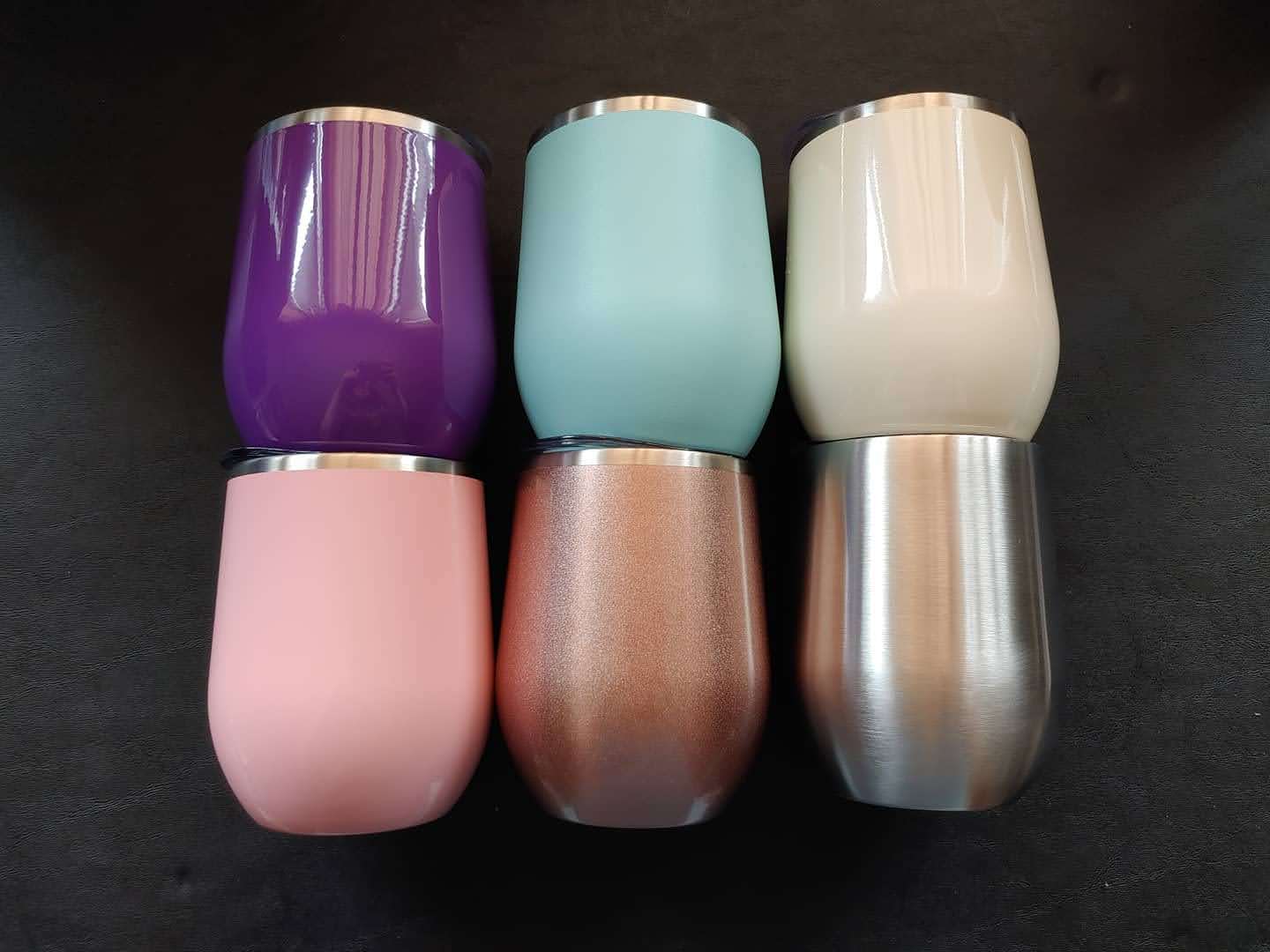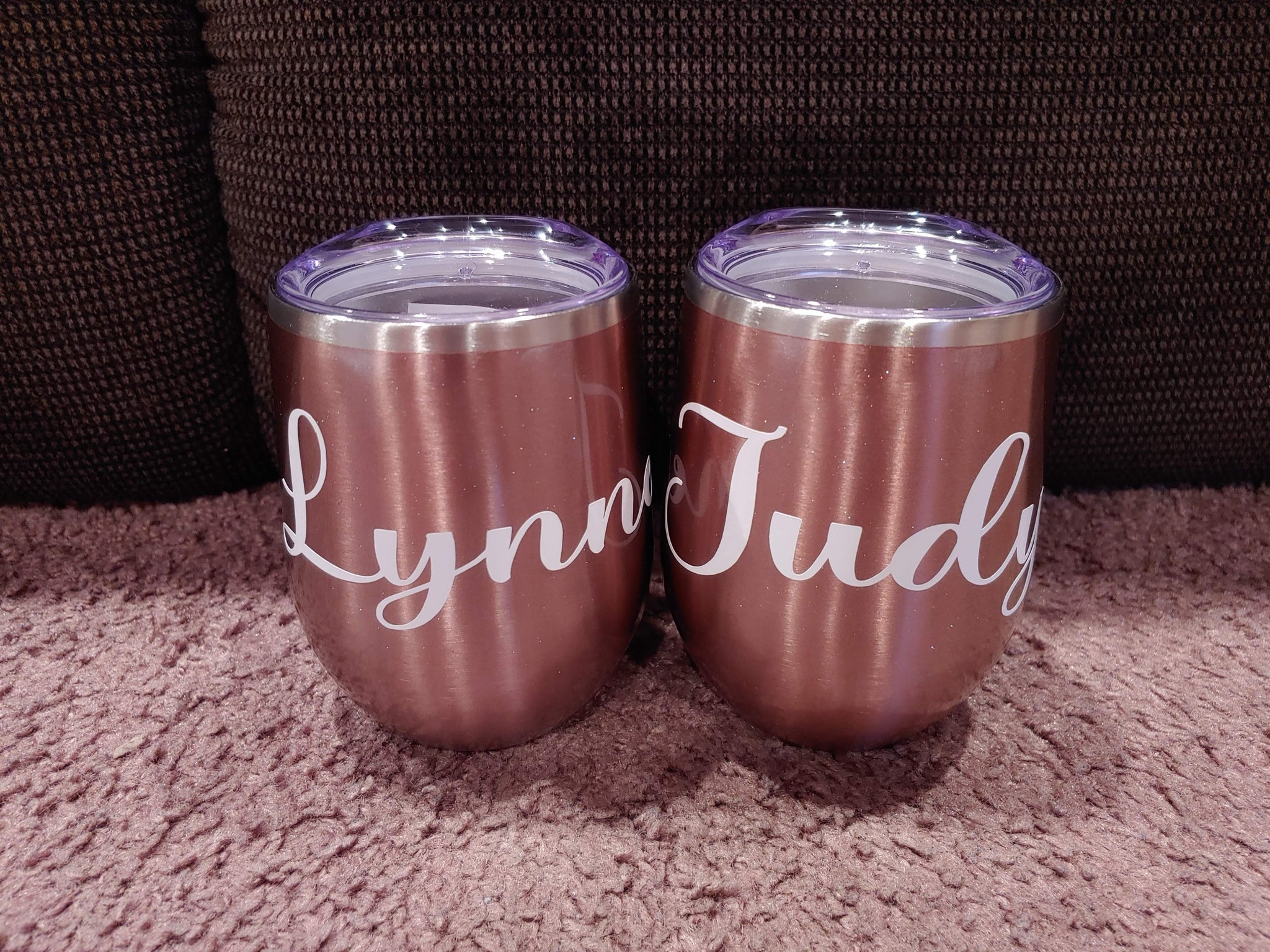 Stainless Steel Insulated Wine Tumbler. Each wine tumbler can hold up to 12 ounces. Each tumbler can be customized to your liking. Please specify your sayings, designs, name and colors.